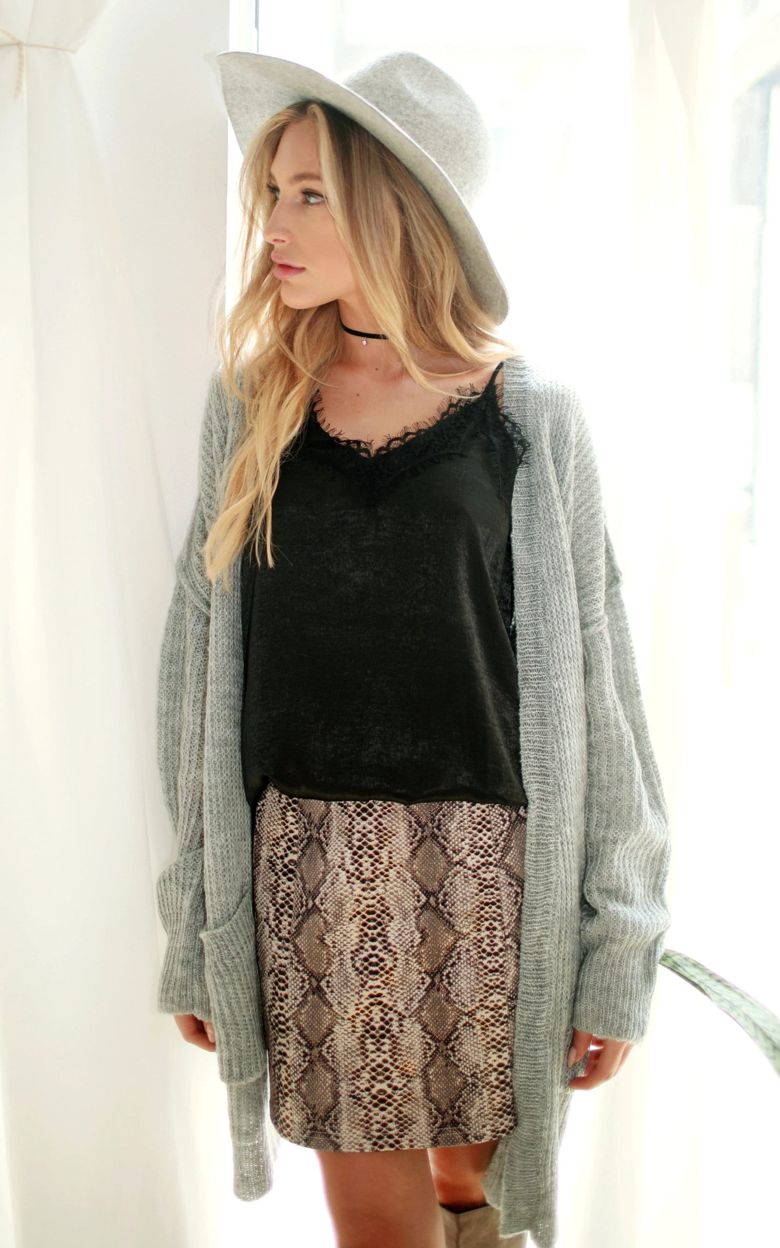 Soft, comfy suede snake print mini skirt with back zipper closure.